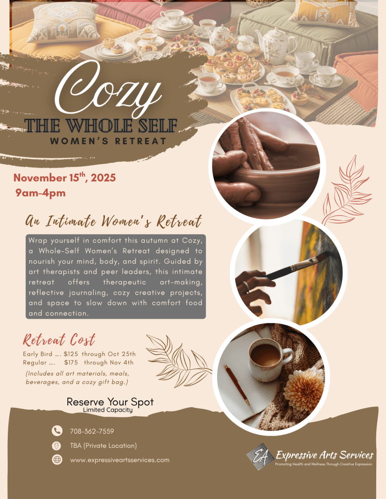 Wrap yourself in comfort this autumn at Cozy, a Whole-Self Women’s Retreat designed to nourish your mind, body, and spirit. Guided by art therapists and peer leaders, this intimate retreat offers therapeutic art-making, reflective journaling, cozy creative projects, and space to slow down with comfort food and connection. Whether you join us for one day or a full weekend, Cozy is your invitation to restore, replenish, and radiate warmth from the inside out.
